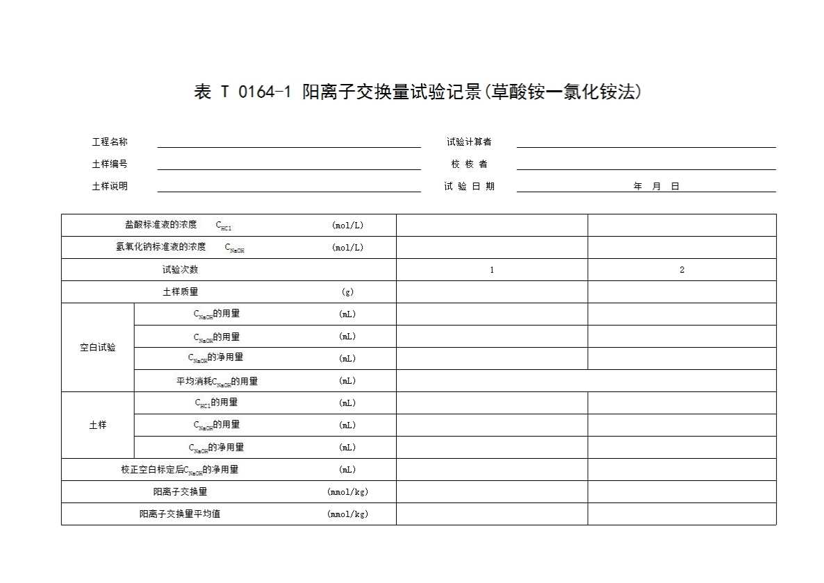 表格名称:表T0164-1 阳离子交换量试验记景(草酸铵一氯化铵法)