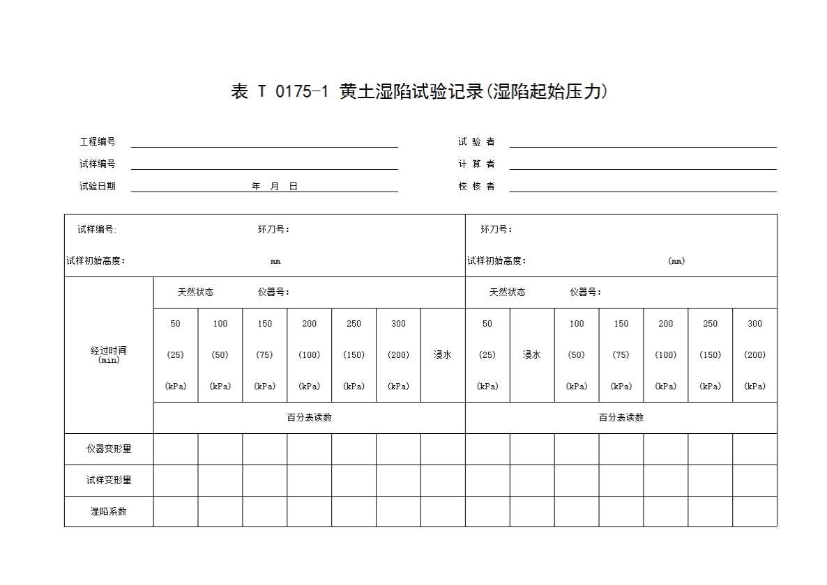表格名称:表T0175-1 黄土湿陷试验记录(湿陷起始压力)