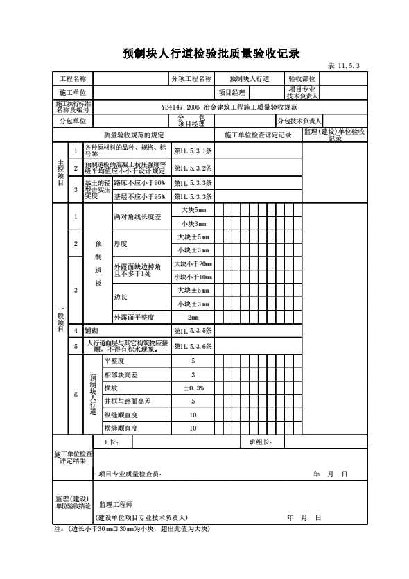 表格名称:表11.5.3 预制块人行道检验批质量验收记录