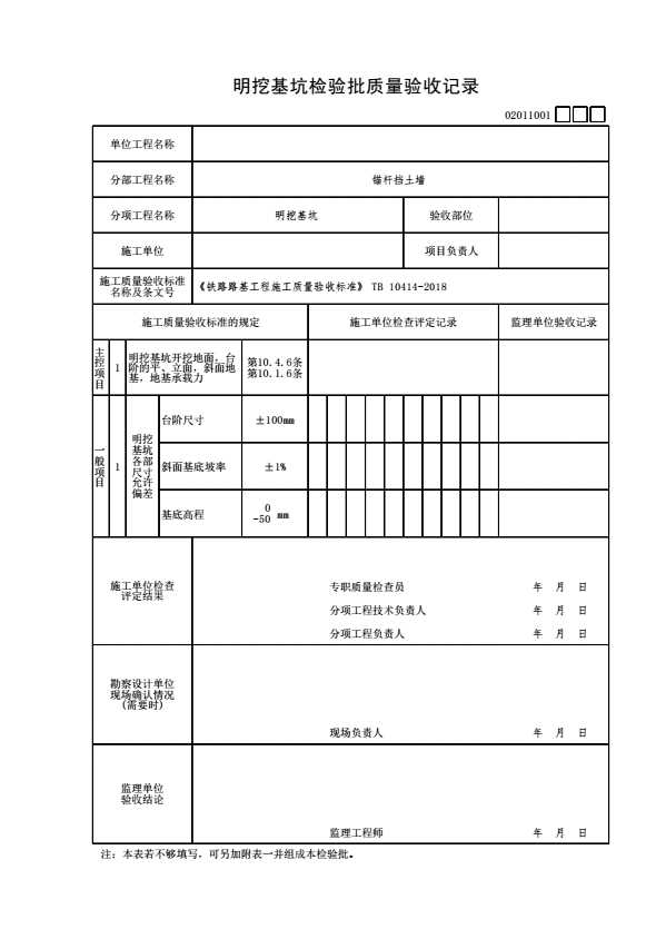表格名称:02011001 明挖基坑检验批质量验收记录