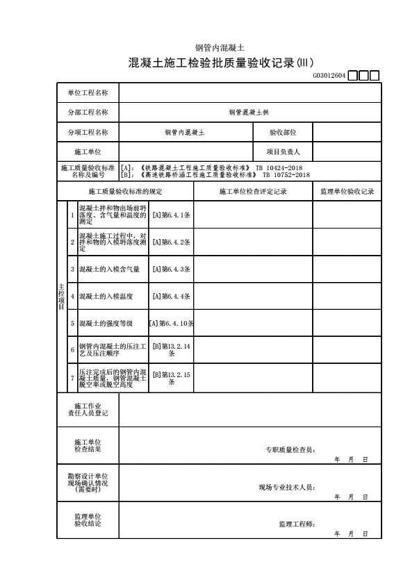 表格名称:G03012604 【钢管内混凝土】混凝土施工检验批质量验收记录(Ⅲ)
