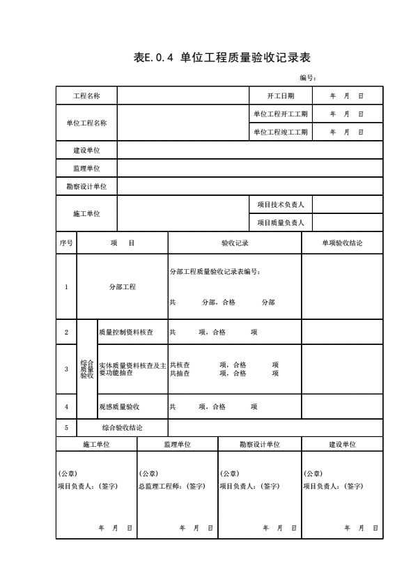 表E.0.4 单位工程质量验收记录表