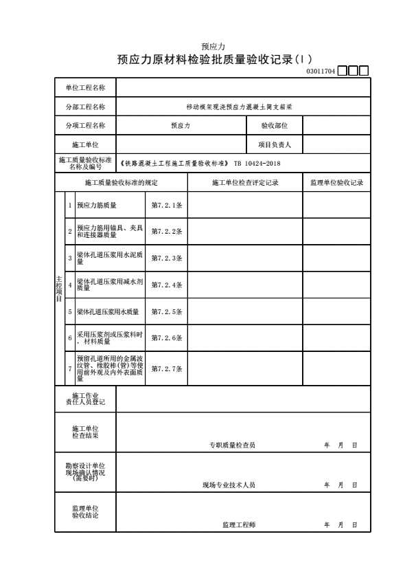 表格名称:03011704 预应力原材料检验批质量验收记录(Ⅰ)
