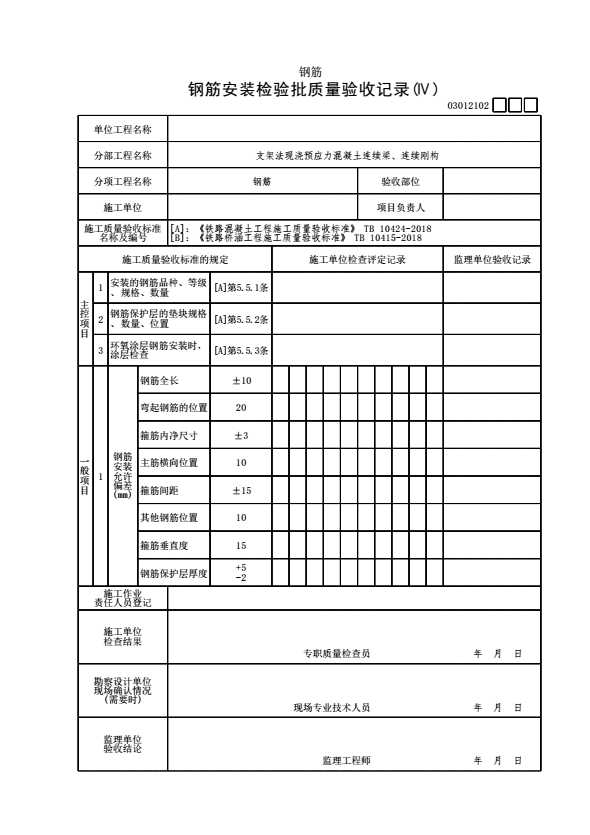 表格名称:03012102 钢筋安装检验批质量验收记录(Ⅳ)
