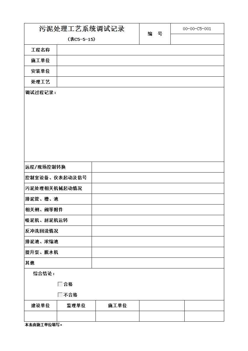 表格名称:C5-5-15 污泥处理工艺系统调试记录