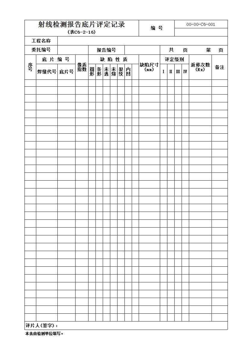 表格名称:C6-2-16 射线检测报告底片评定记录