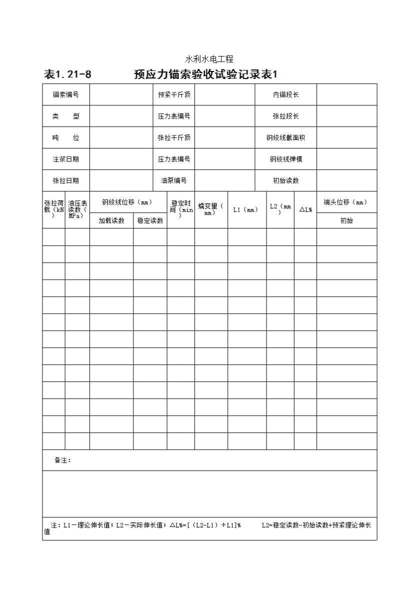 表格名称:表1.21-8 预应力锚索验收试验记录表1