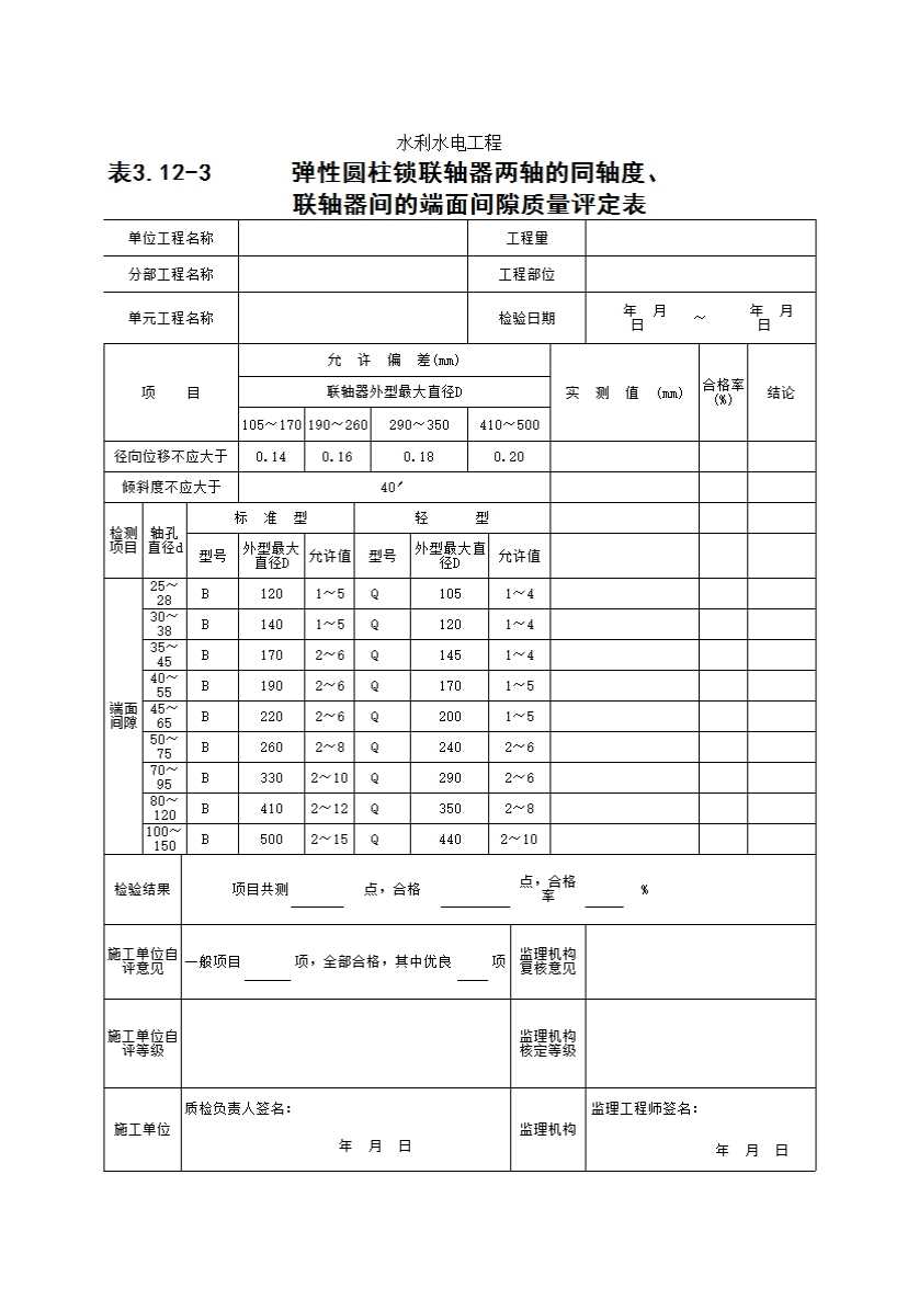 表格名称:表3.12-3 弹性圆柱锁联轴器两轴的同轴度、联轴器间的端面间隙质量评定表