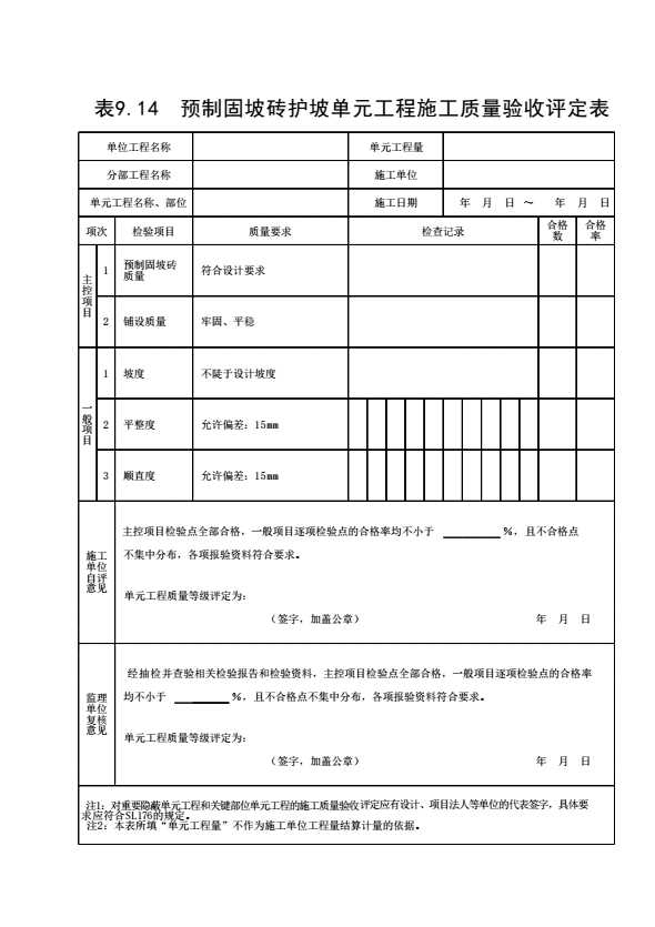 表格名称:表9.14 预制固坡砖护坡单元工程施工质量验收评定表