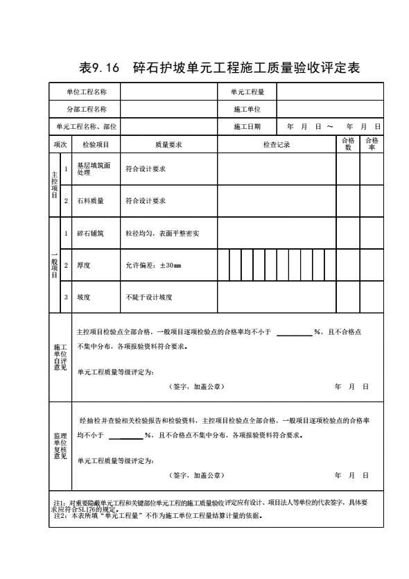 表格名称:表9.16 碎石护坡单元工程施工质量验收评定表