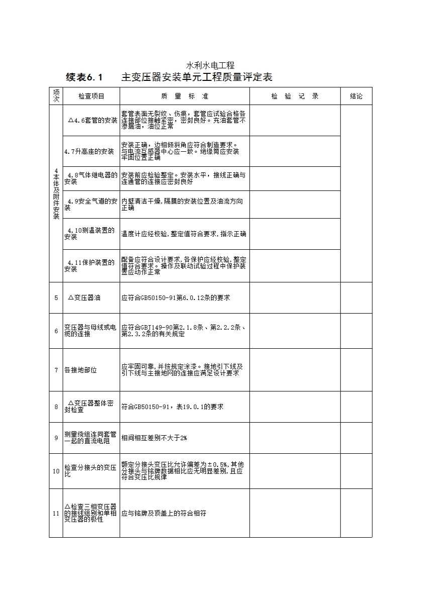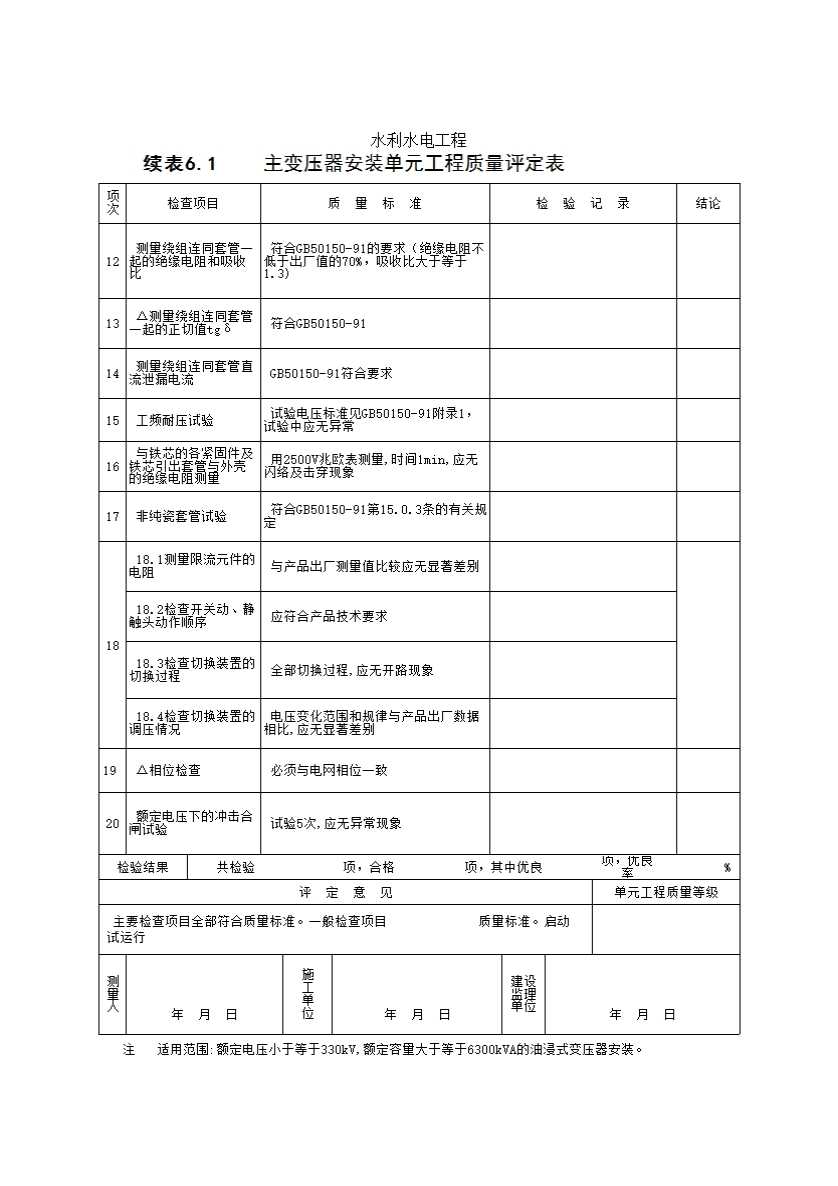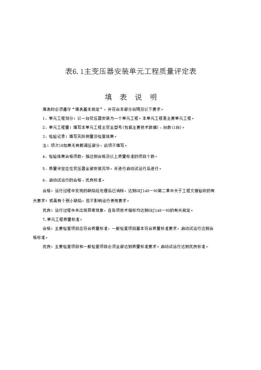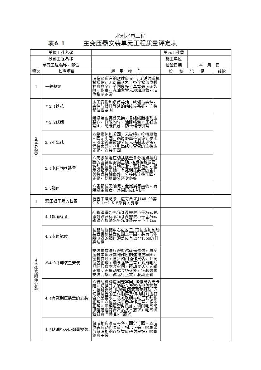 表格名称:表6.1 主变压器安装单元工程质量评定表