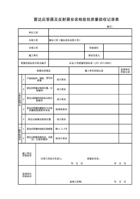 表格名称:雷达应答器及反射器安装检验批质量验收记录表