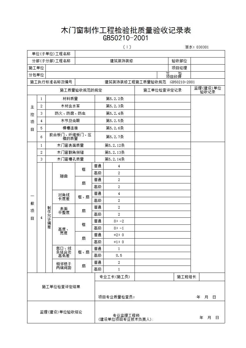 表格名称:116 木门窗制作工程检验批质量验收记录表(I)