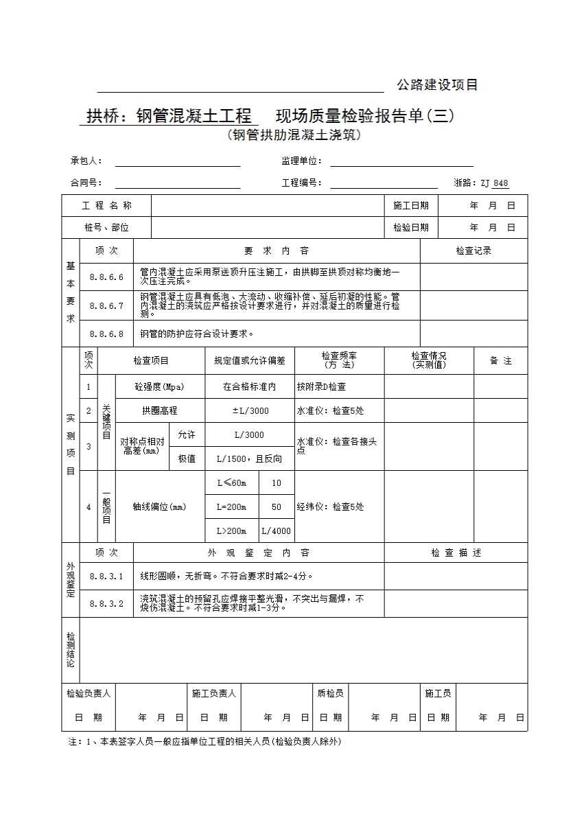 表格名称:浙路ZJ848 拱桥:钢管混凝土工程现场质量检验报告单(三)