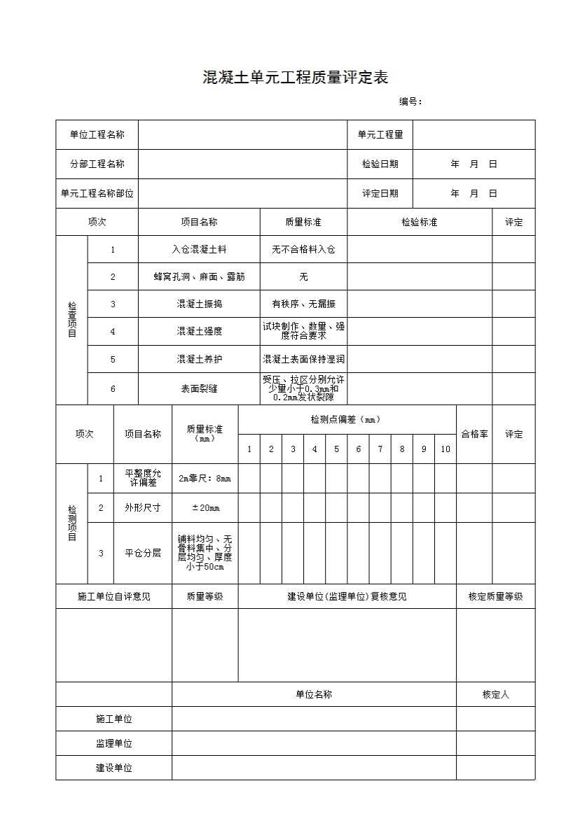 表格名称:混凝土单元工程质量评定表