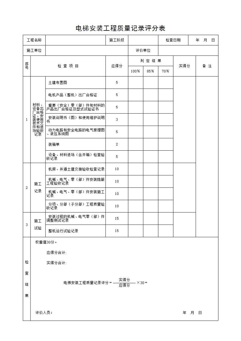 电梯安装工程质量记录评分表