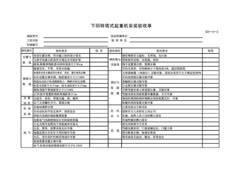 表格名称:下回转塔式起重机安装验收单 安6—5—2