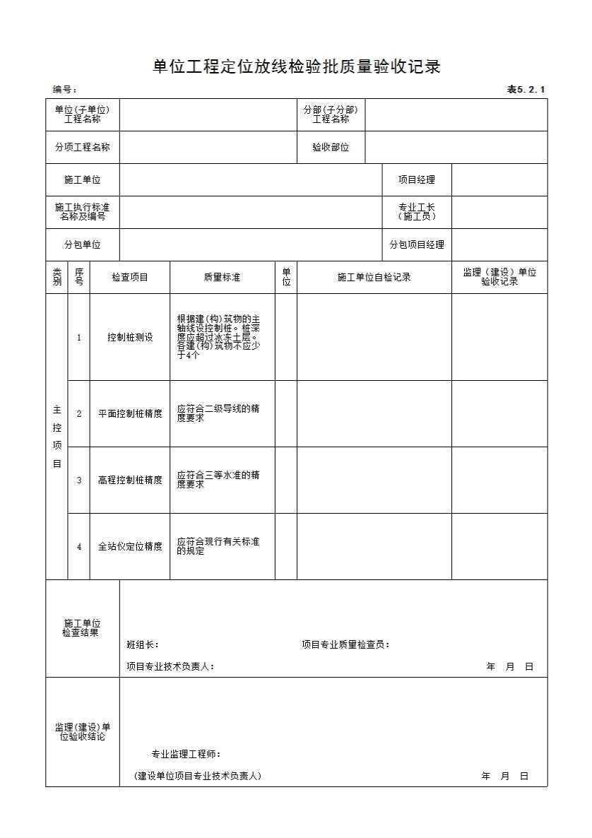 表格名称:5.2.1 单位工程定位放线检验批质量验收记录
