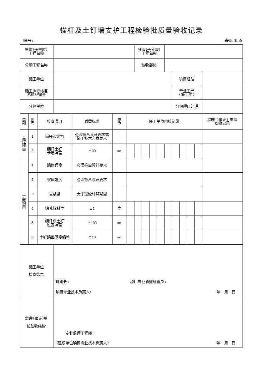 表格名称:5.3.6 锚杆及土钉墙支护工程检验批质量验收记录