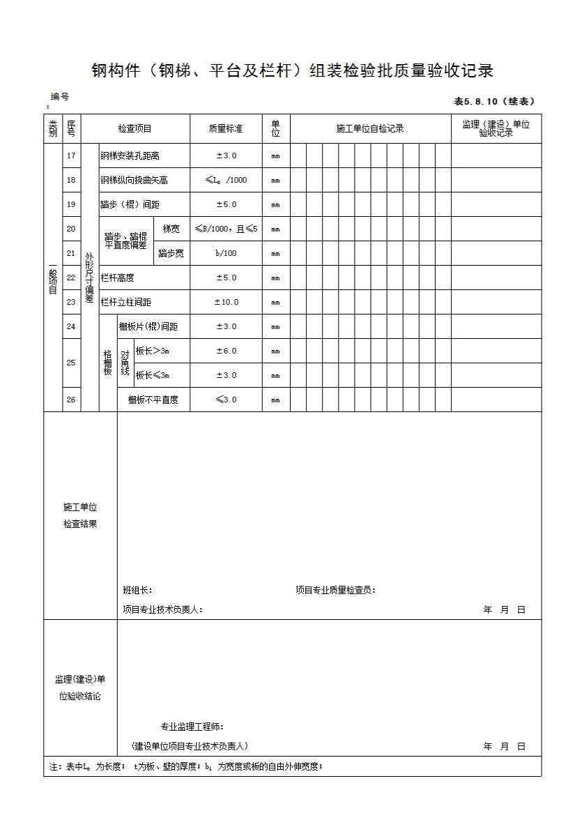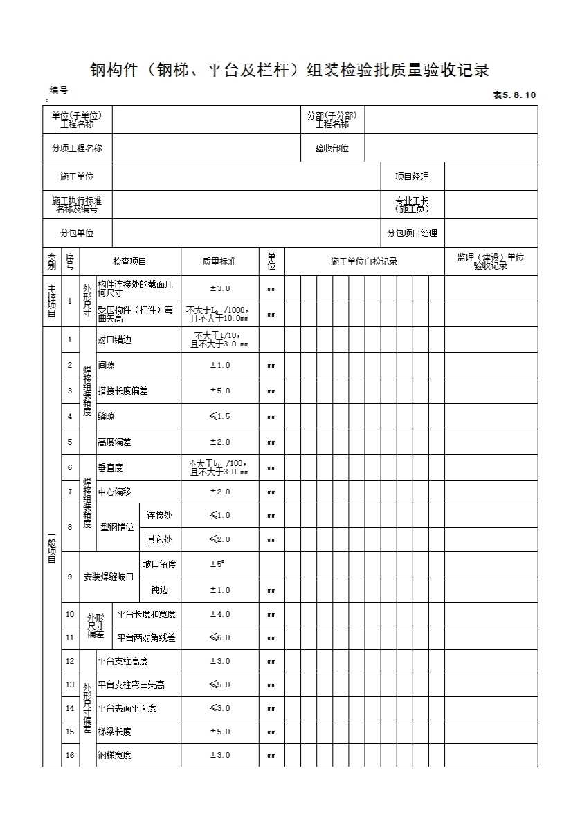 表格名称:5.8.10 钢构件(钢梯、平台及栏杆)组装检验批质量验收记录