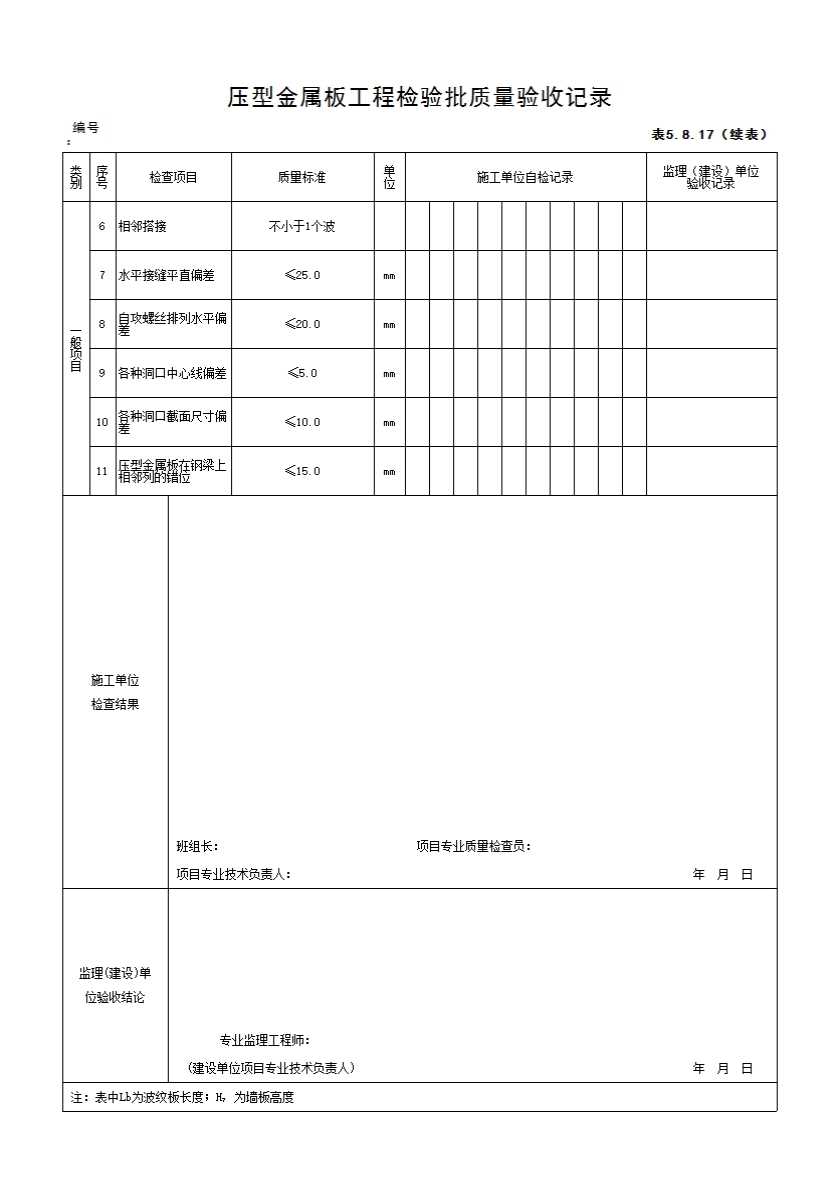 表格名称:5.8.17 压型金属板工程检验批质量验收记录