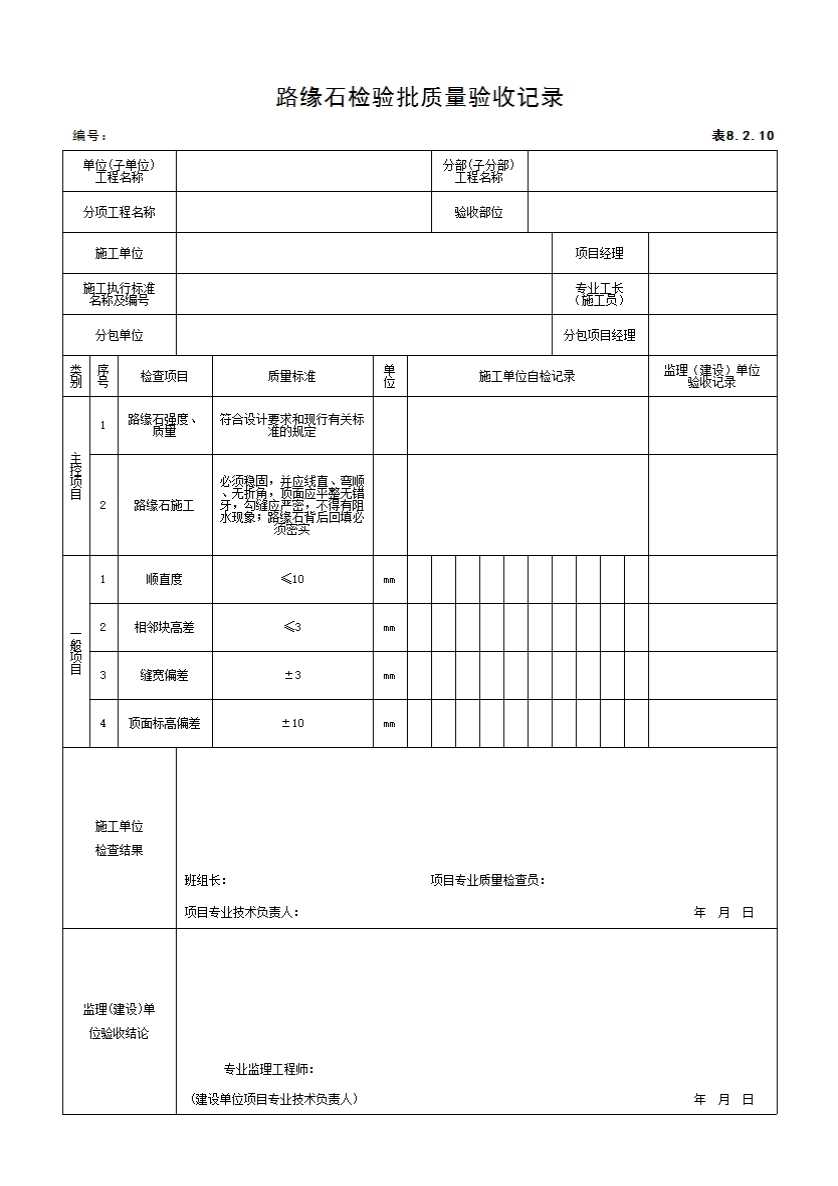 表格名称:8.2.10 路缘石检验批质量验收记录