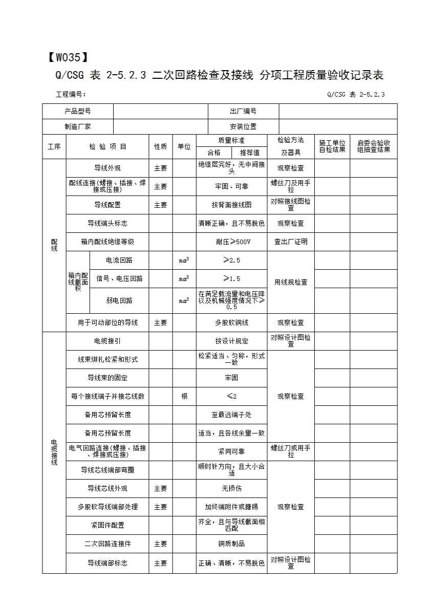 QCSG 表 2-5.2.3 二次回路检查及接线 分项工程质量验收记录表