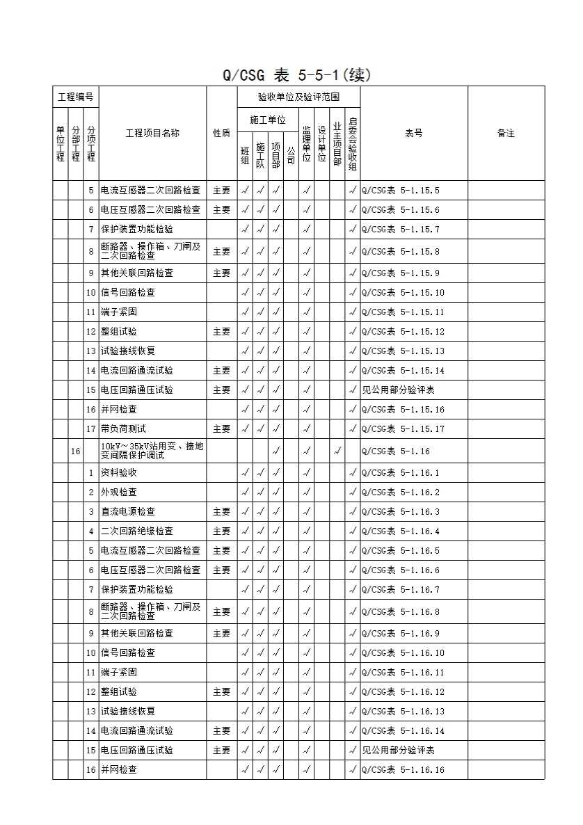 QCSG 表 5-5-1 变电继电保护调试工程质量验收评定范围划分