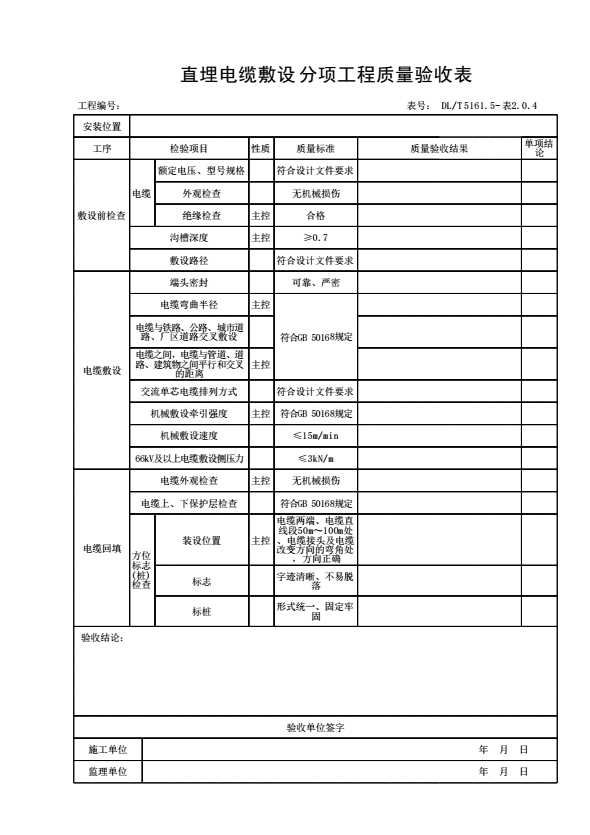表格名称:表2.0.4 直埋电缆敷设分项工程质量验收表