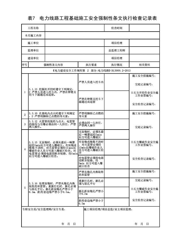 表格名称:表7 电力线路工程基础施工安全强制性条文执行检查记录表