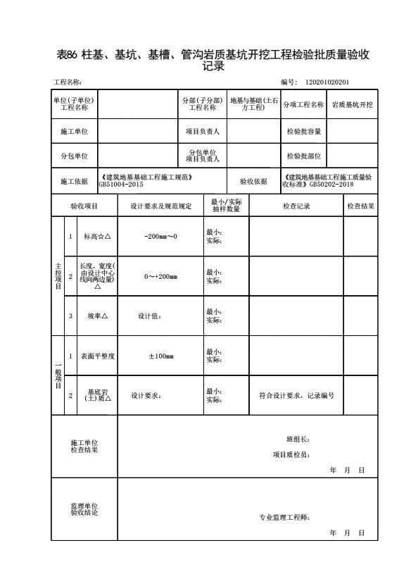 表格名称:120201020201 柱基、基坑、基槽、管沟岩质基坑开挖工程检验批质量验收记录