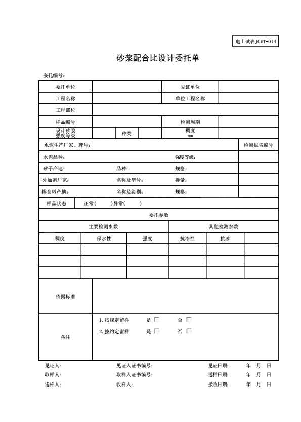 电土试表JCWT-014 砂浆配合比设计委托单