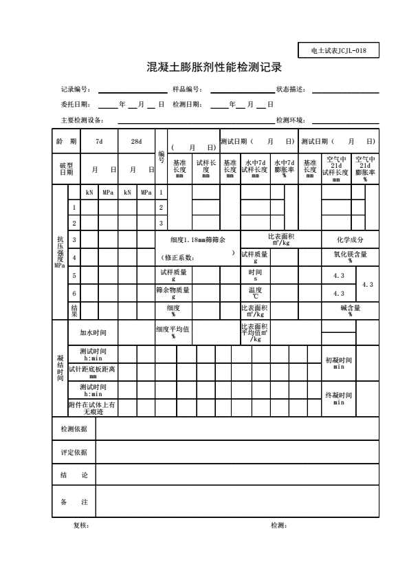 电土试表JCJL-018 混凝土膨胀剂性能检测记录