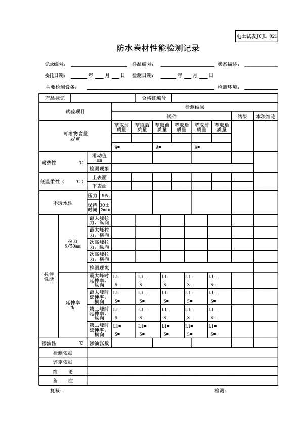 表格名称:电土试表JCJL-021 防水卷材性能检测记录