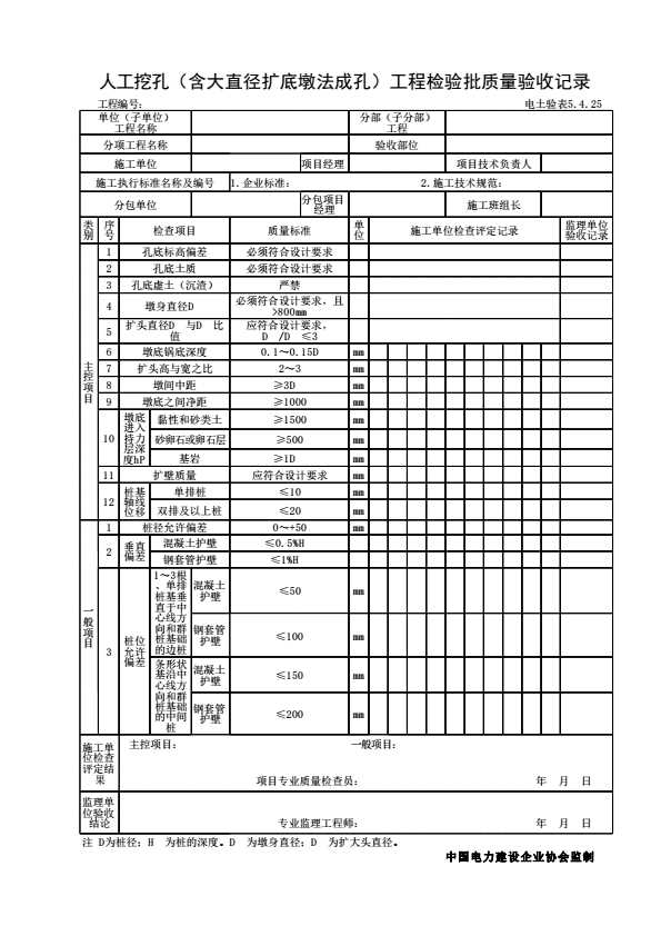 表格名称:电土验表5.4.25 人工挖孔(含大直径扩底墩法成孔)工程检验批质量验收记录