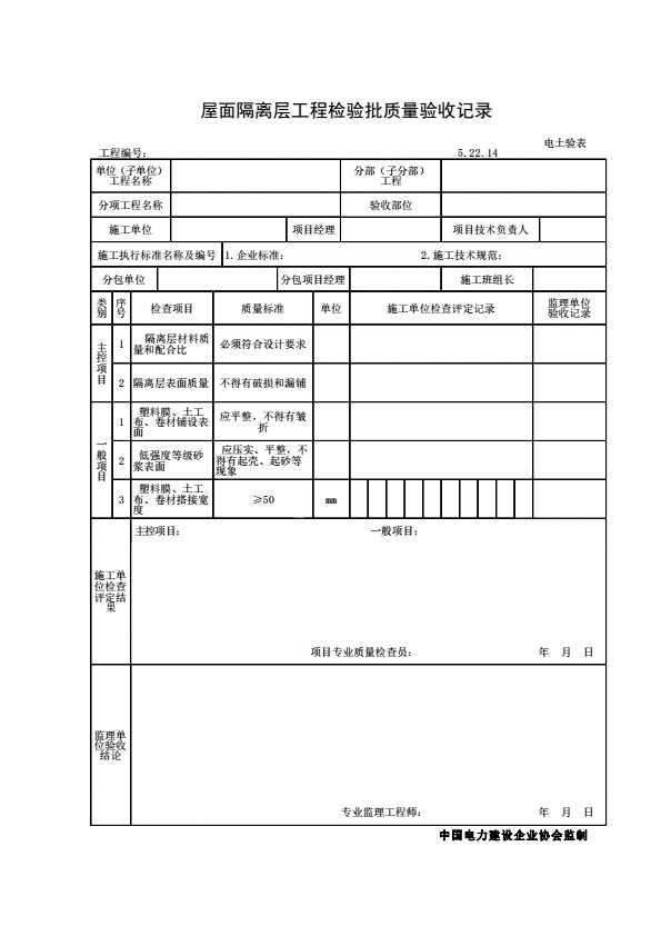 表格名称:电土验表5.22.14 屋面隔离层工程检验批质量验收记录