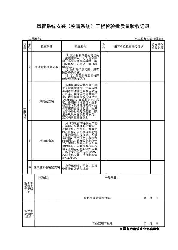 表格名称:电土验表5.27.5 风管系统安装(空调系统)工程检验批质量验收记录