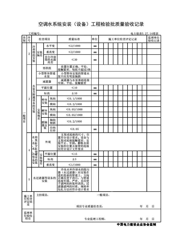 表格名称:电土验表5.27.14 空调水系统安装(设备)工程检验批质量验收记录