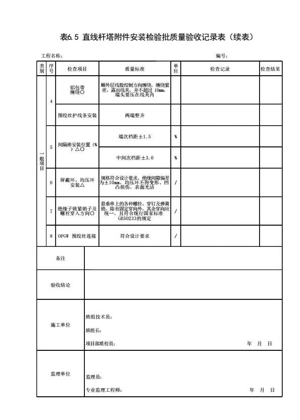表格名称:表6.5 直线杆塔附件安装检验批质量验收记录表