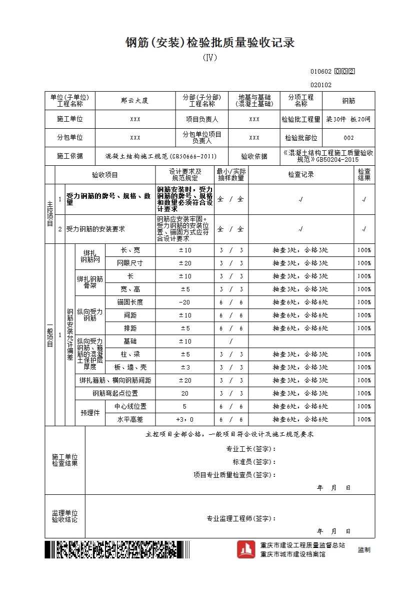 钢筋安装检验批质量验收记录