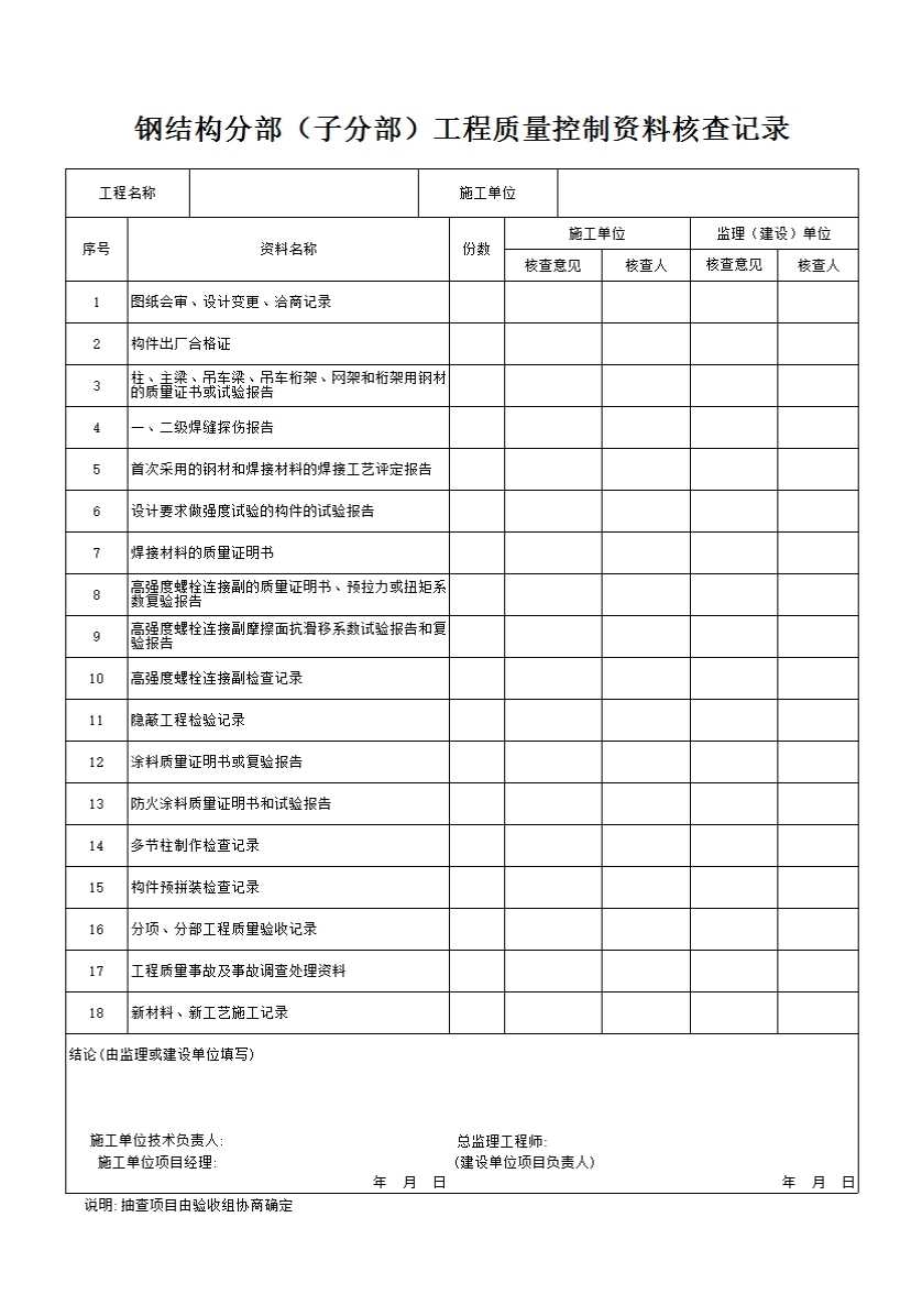 表格名称:钢结构分部(子分部)工程质量控制资料核查记录