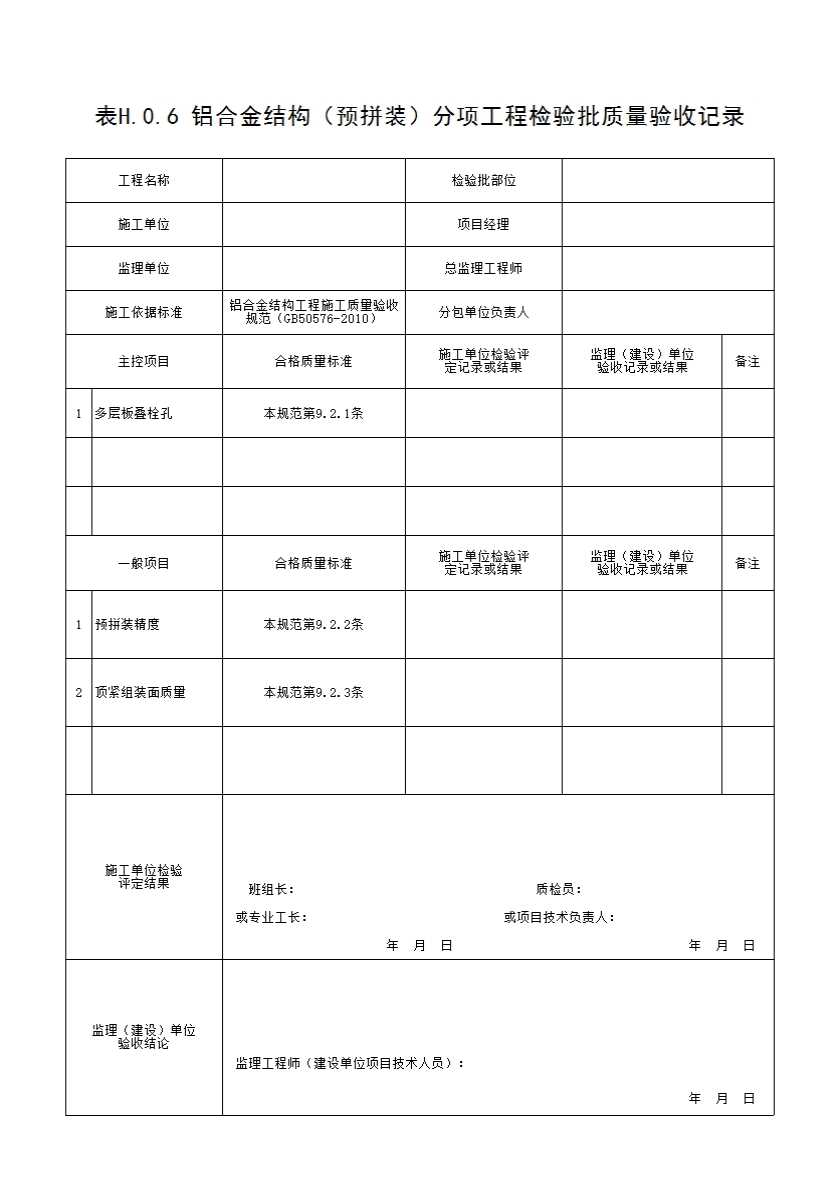表格名称:表H.0.6 铝合金结构(预拼装)分项工程检验批质量验收记录
