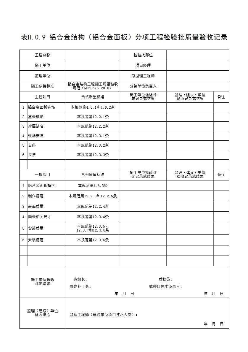 表格名称:表H.0.9 铝合金结构(铝合金面板)分项工程检验批质量验收记录