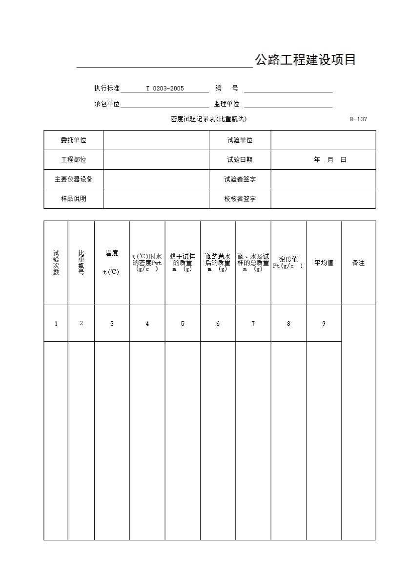表格名称:D-137 密度试验记录表(比重瓶法)