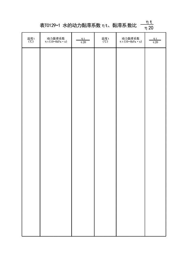 表T0129-1 水的动力黏滞系数、黏滞系数比
