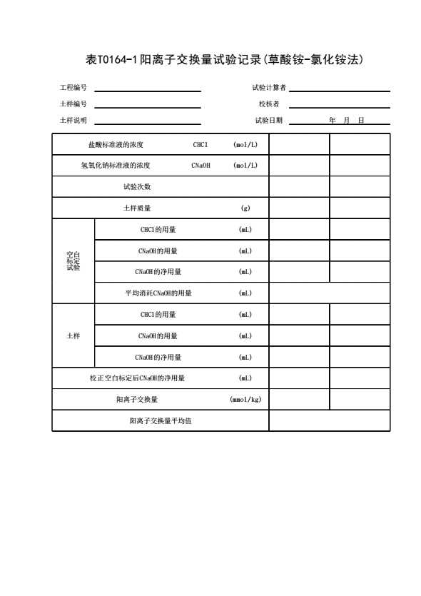 表格名称:表T0164-1 阳离子交换量试验记录(草酸铵-氯化铵法)