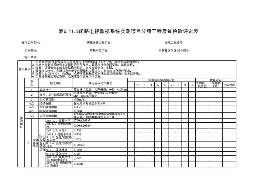 表格名称:表6.11.2 闭路电视监视系统实测项目分项工程质量检验评定表
