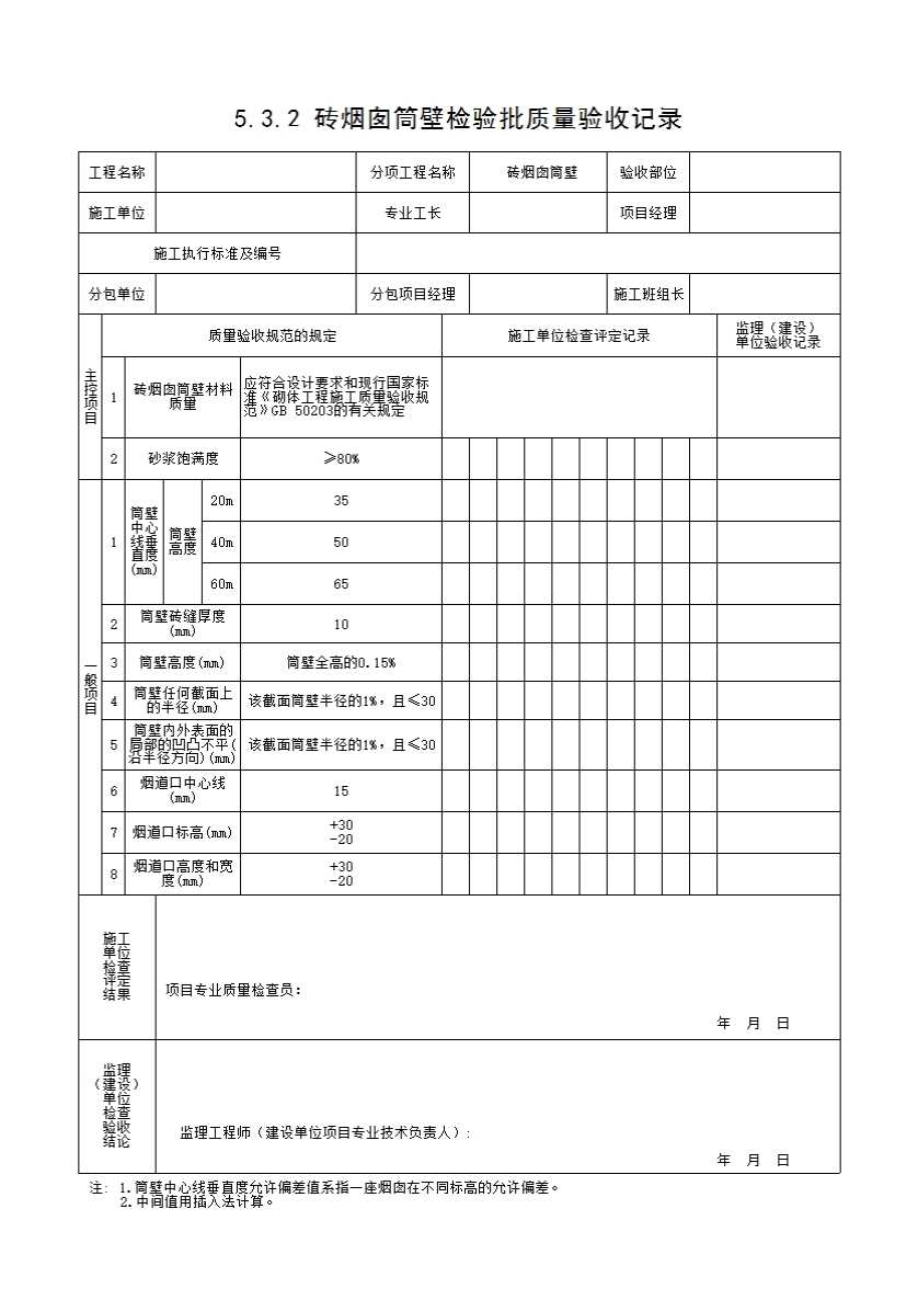 表格名称:5.3.2 砖烟囱筒壁检验批质量验收记录