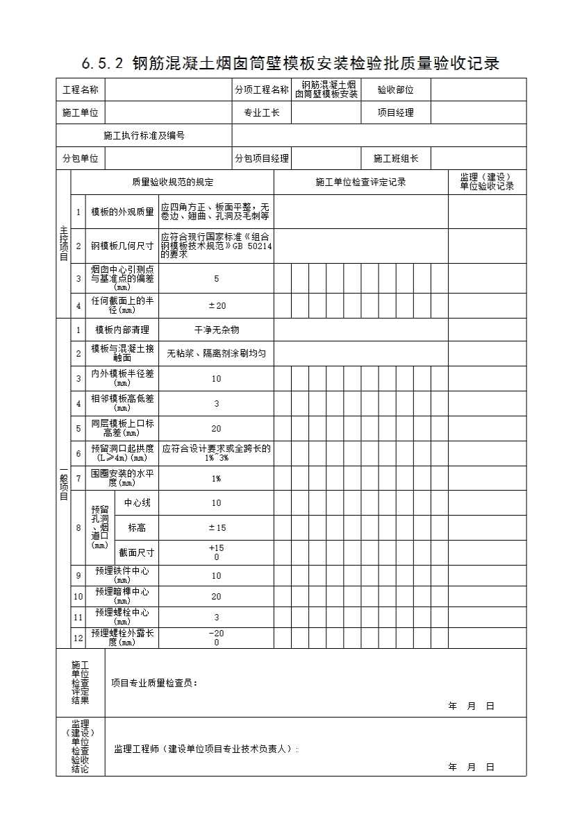 表格名称:6.5.2 钢筋混凝土烟囱筒壁模板安装检验批质量验收记录