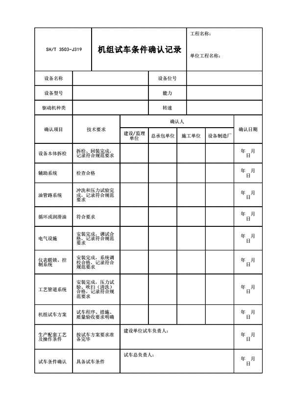 表格名称:SH/T 3503-J319 机组试车条件确认记录